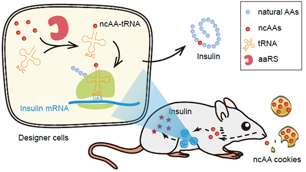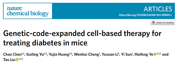 2021年11月15日,北京大学刘涛团队与我院叶海峰团队在Nature Chemical Biology杂志发表了题为Genetic code expanded cell-based therapy for treating diabetes in mice的研究论文。文章利用基因密码子扩展技术开发了非天然氨基酸调控的胰岛素细胞治疗系统(Noncanonical Amino acids (ncAAs)-triggered Therapeutic Switch, NATS),证明了该系统能够在翻译水平快速调控蛋白质表达(图1)。该研究补充了合成生物学中的蛋白调控开关工具库,也为基因密码子扩展技术的应用创新提供了新的思路。