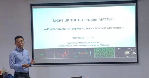 A 2019年11月1日,上海交通大学医学院王炜博士来我院进行学术交流,为我院师生带来题为“LIGHT UP THE GUT ‘DARK MATTER’—DEVELOPMENT OF CHEMICAL TOOLS FOR GUT MICROBIOTA”精彩的学术报告,报告由张美玲教授主持。