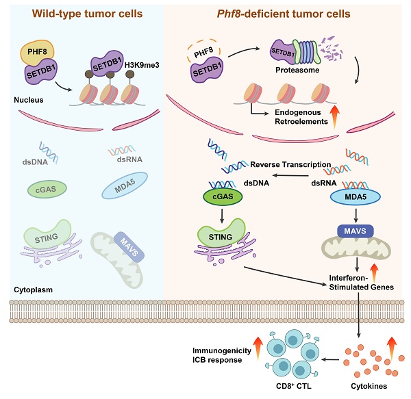 2023年7月15日,做爱视频 逄秀凤教授课题组和广州实验室何江平研究员课题组合作在Nature Communications 杂志在线发表题为Loss of PHF8 induces a viral mimicry response by activating endogenous retrotransposons的研究论文7。该研究发现,组蛋白去甲基化酶PHF8(KDM7B)可作为新的表观遗传检查点调控肿瘤免疫逃逸。干预PHF8可引起细胞核内甲基转移酶SETDB1降解,转录激活H3K9me3修饰的逆转录转座子,引起肿瘤内抗病毒应答和抗肿瘤免疫反应,从而阻断肿瘤生长。该研究揭示了PHF8新的生物学功能,为提高ICB抗肿瘤效用提供新思路,也为后续PHF8抑制剂或降解剂的开发奠定理论基础。