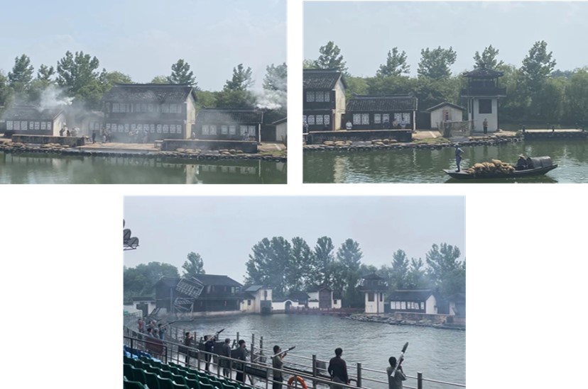 随后,大家观看了《芦荡烽火》实景剧。该剧主要演绎了沙家浜地区军民团结一心、打破敌寇封湖诡计,顺利掩护伤病员的故事。通过实景火爆、水爆、动作打斗等体验,还原了那段战火纷飞、军民相拥的真实历史。