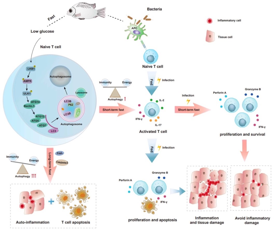 在机制上,饥饿诱发了T细胞自噬。而抑制自噬,则损伤了T细胞的激活、增殖和免疫功能。随着饥饿时间的延长,T细胞自噬加剧;长期饥饿触发强烈自噬,导致T细胞凋亡,破坏免疫细胞稳态。进一步的研究表明,饥饿通过生物能量枢纽AMPK通路介导T细胞的自噬。阻断AMPK通路,不仅降低了T细胞的自噬水平,造成免疫功能障碍,更损伤了T细胞在能量限制情况下维持存活的能力。实际上,细菌感染同样能够引发罗非鱼T细胞的自噬;而在短期饥饿的状态下遭遇感染,能够将自噬窗口提前,加快T细胞的应答速度,增强抗感染免疫能力,减少T细胞的凋亡,并降低组织损伤。