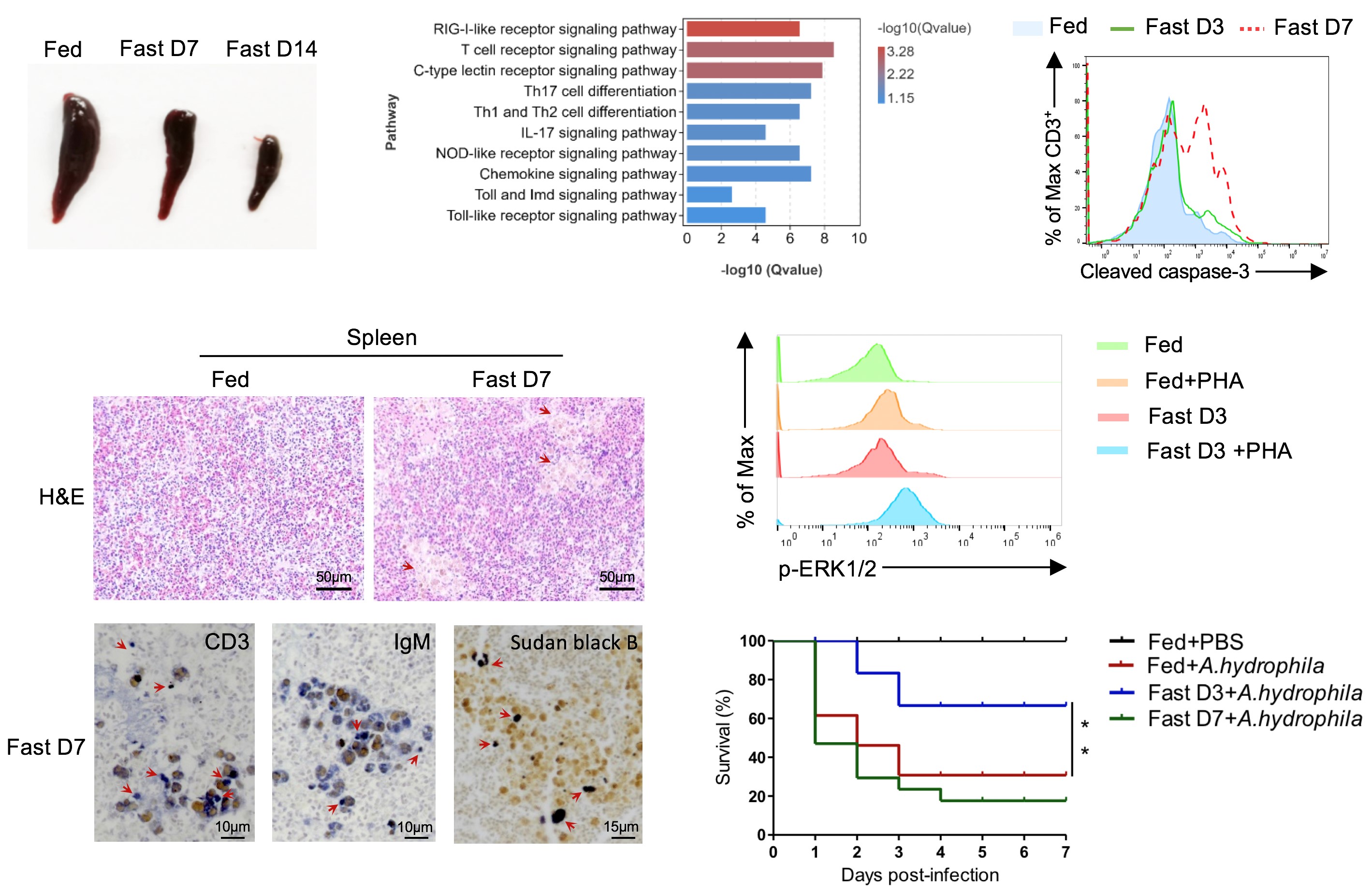 作者发现,T细胞是罗非鱼免疫系统响应饥饿的主要应答者。长期饥饿导致脾脏萎缩、T细胞凋亡和自发炎症,损伤了免疫细胞稳态,使鱼类更容易遭受细菌感染。相反,短期饥饿可在不影响免疫细胞稳态的前提下,提高T细胞应对抗原的激活和分化能力,增强抗感染免疫。
