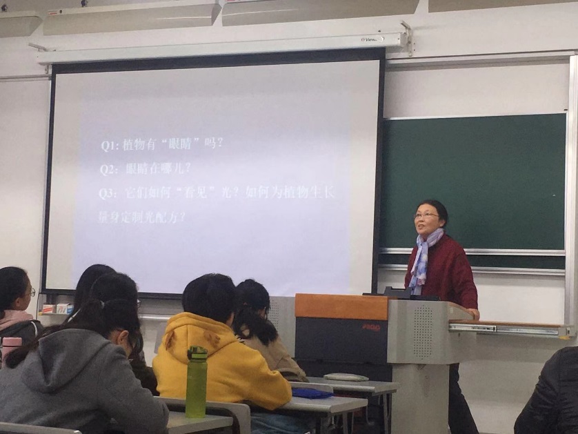 课堂伊始,李小方老师结合课程内容,提出了与同学生活息息相关的问题,“植物有‘眼睛’吗?”、“眼睛在哪儿?”、“它们如何‘看见’光?如何为植物生长量身定制光配方?”。这些问题的提出,极大的吸引了学生的注意力,激发其好奇心。随后引入莴苣种子萌发率受到光照影响,并通过举例,引出光敏色素并介绍其化学性质和光化学转换,最后介绍了光敏色素的生理功能。课堂上,师生互动频繁,李老师上课张弛有度,学生回答落落大方。随着下课铃声的想起。本次《普通生物学-植物生理部分》公开课暂时告一段落。