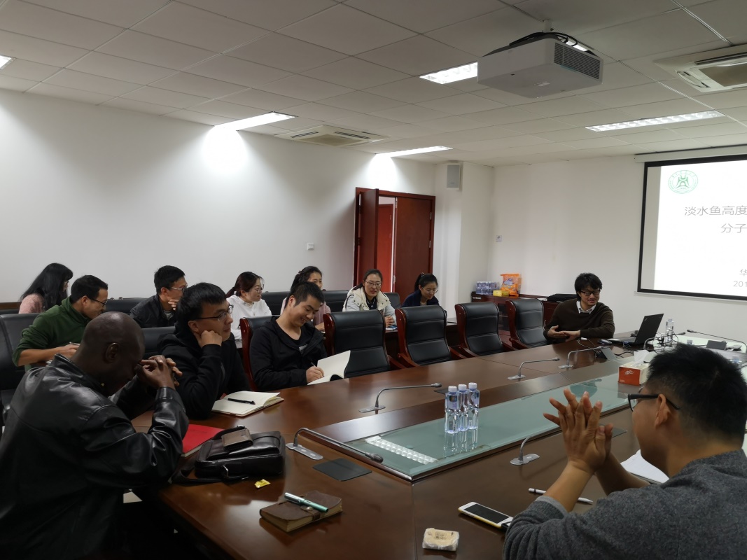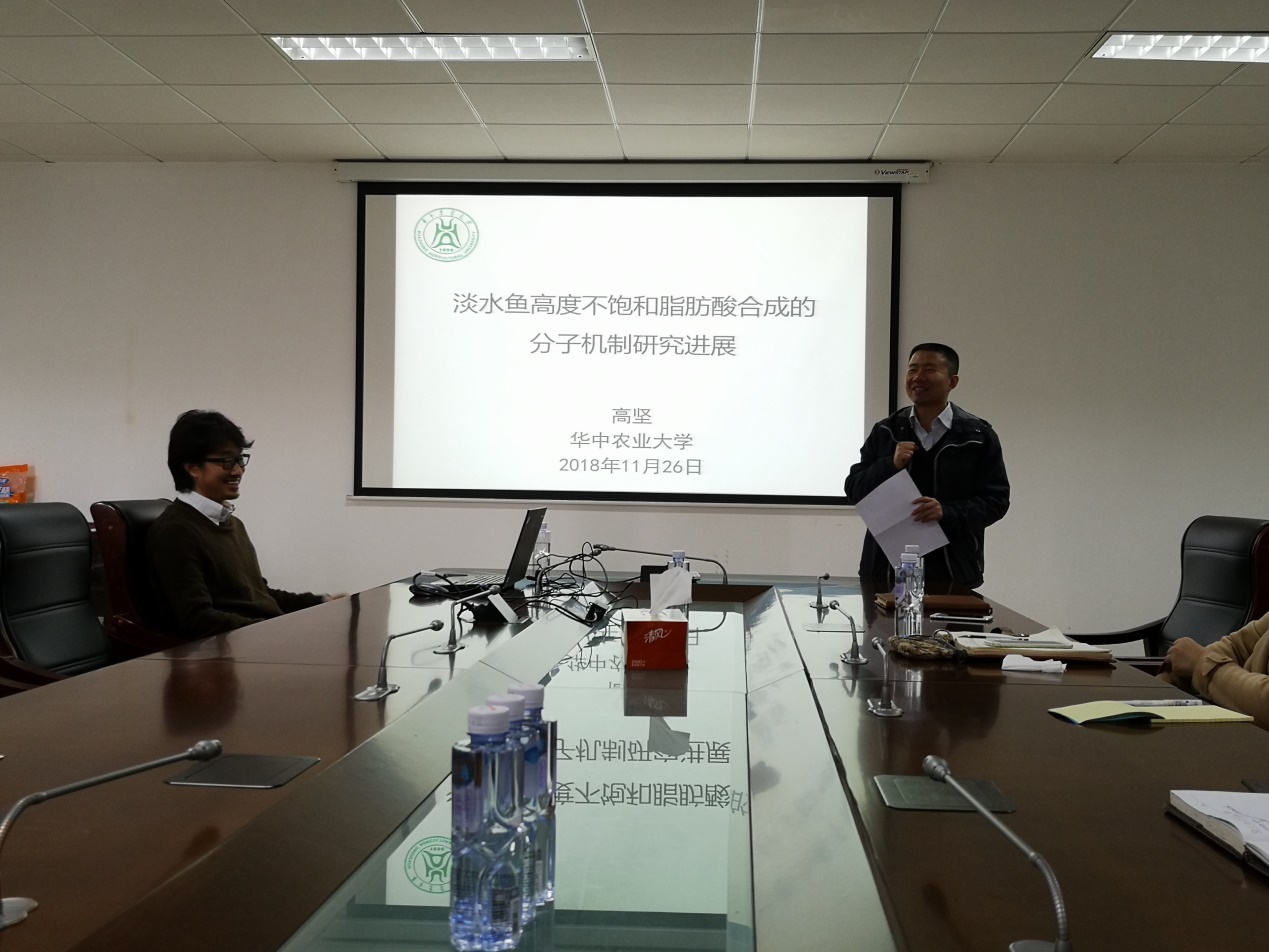 2018年11月26日上午,华中农业大学水产学院高坚教授应邀访问我院,并在做爱视频 534小会议室做学术报告,报告题目为《淡水鱼高度不饱和脂肪酸合成的分子机制研究进展》。本次报告由做爱视频 杜震宇教授主持,动物学科相关师生聆听了本次报告。