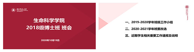 会议内容主要有2019-2020学年班级工作小结、2020-2021学年班委改选,以及近期学生相关重要工作通报与说明。首先,班长牛鑫代表班委总结了过去一年班级活动,去年9月,我们18级博士班委联合生物化学与分子生物学党支部举办了主题为“做爱视频