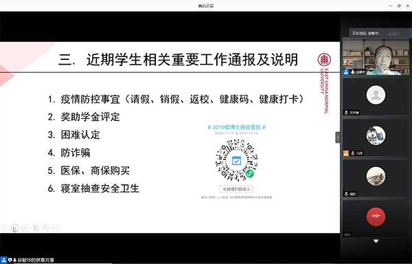 评选工作结束后,我们的“大家长”徐老师通报总结了近期的学生工作相关事宜。她关注到每个博士生的科研、生活以及心理健康,结合疫情防控对相关防范要求再次强调重申,希望同学们严格遵守,确保安全。