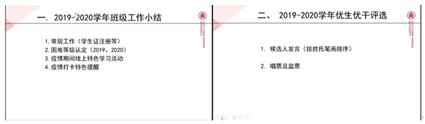 2020年11月19日晚上8点,在班长马硕的号召以及其它班委的协助筹备下,我院2019级博士研究生以线上形式在腾讯会议app顺利召开,会议由辅导员徐敏华老师主持。围绕着2019-2020年班级工作总结、2020年优生优干评选、以及近期学生工作相关事宜通报三项议题展开,旨在总结近一年半的博士工作,增进师生之间的情感交流,也为接下来的博士生涯夯实基础,砥砺前行。