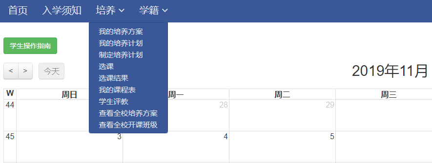 进入到学生页面点击顶部菜单栏中的“培养”,目前有“我的培养方案”、“我的培养计划”、“制定培养计划”、“选课”、“选课结果”、“我的课程表”、“学生评教”、“查看全校培养方案”和“查看全校开课班级”等八个功能模块。如图4,下面详解每项功能操作。