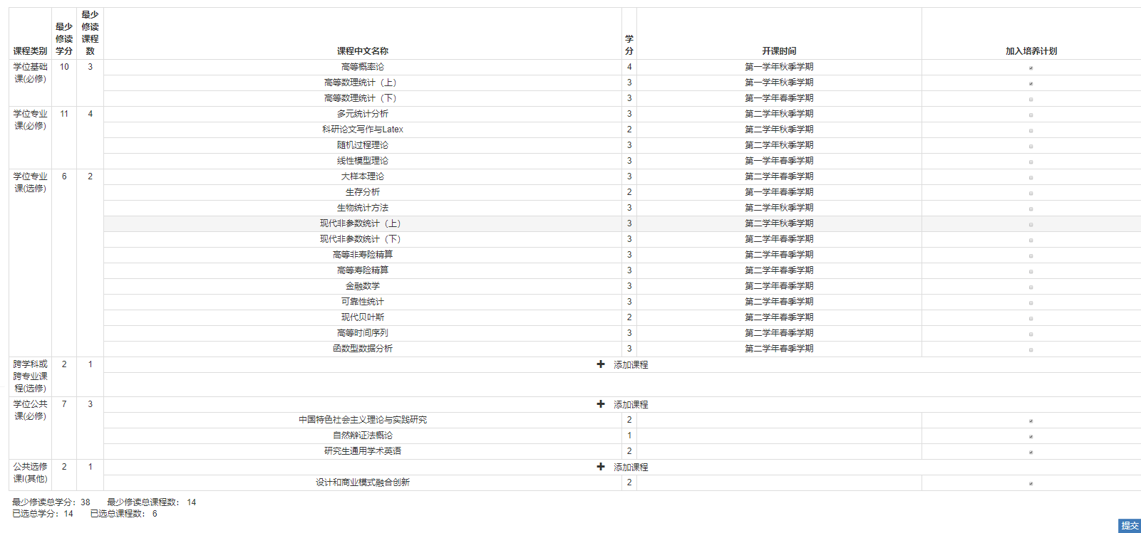 在培养方案已经分配好的情况下,学生可制定自己的培养计划,确定需修读的课程(在培养方案范围内),选择好课程后按提交按键保存培养计划,见图7。