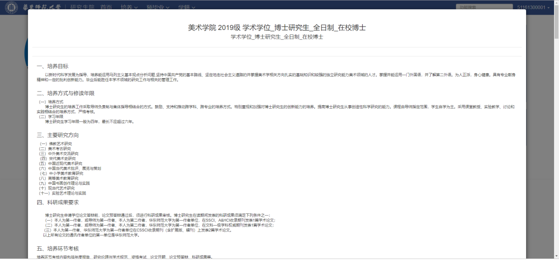 学生可查询自己的培养方案内容,查看本人研究生培养期间需完成的课程修读要求和培养环节,见图5。可能会有部分学生还未分配培养方案,会提示“您尚未分配培养方案”错误。