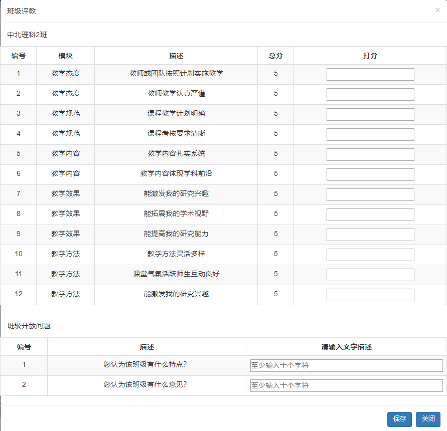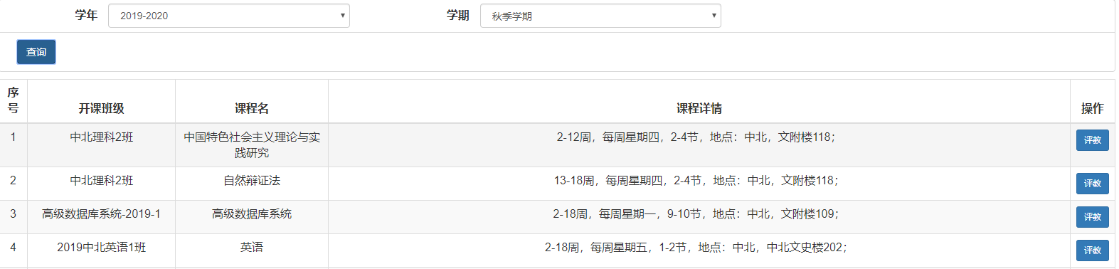 学生根据学年学期筛选某个学期所上的课,然后点击对应的评教按钮即可进入评教页面,见图19。