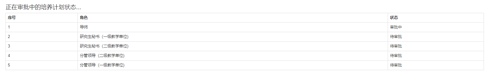 培养计划修改完成后点击页面右下角的“提交按钮”进行保存。保存完成后,将会进入培养计划审批流程。在制定培养计划页面的首部可以看到当前审批流程的状态。如学生存在疑问,可以找对应流程的审批人进行询问。