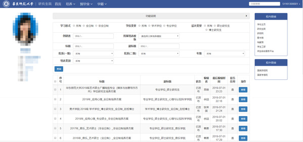 学生使用谷歌浏览器Chrome,由华师大的统一身份认证平台登录系统,地址是://idc.zuoaisp8.com,使用学生自己的公共数据库账号和密码登录(见图1),登陆后访问“研究生系统”,选择点击“我的学习新(选课)”菜单(见图2),选择“学生”权限进入研究生院管理系统。