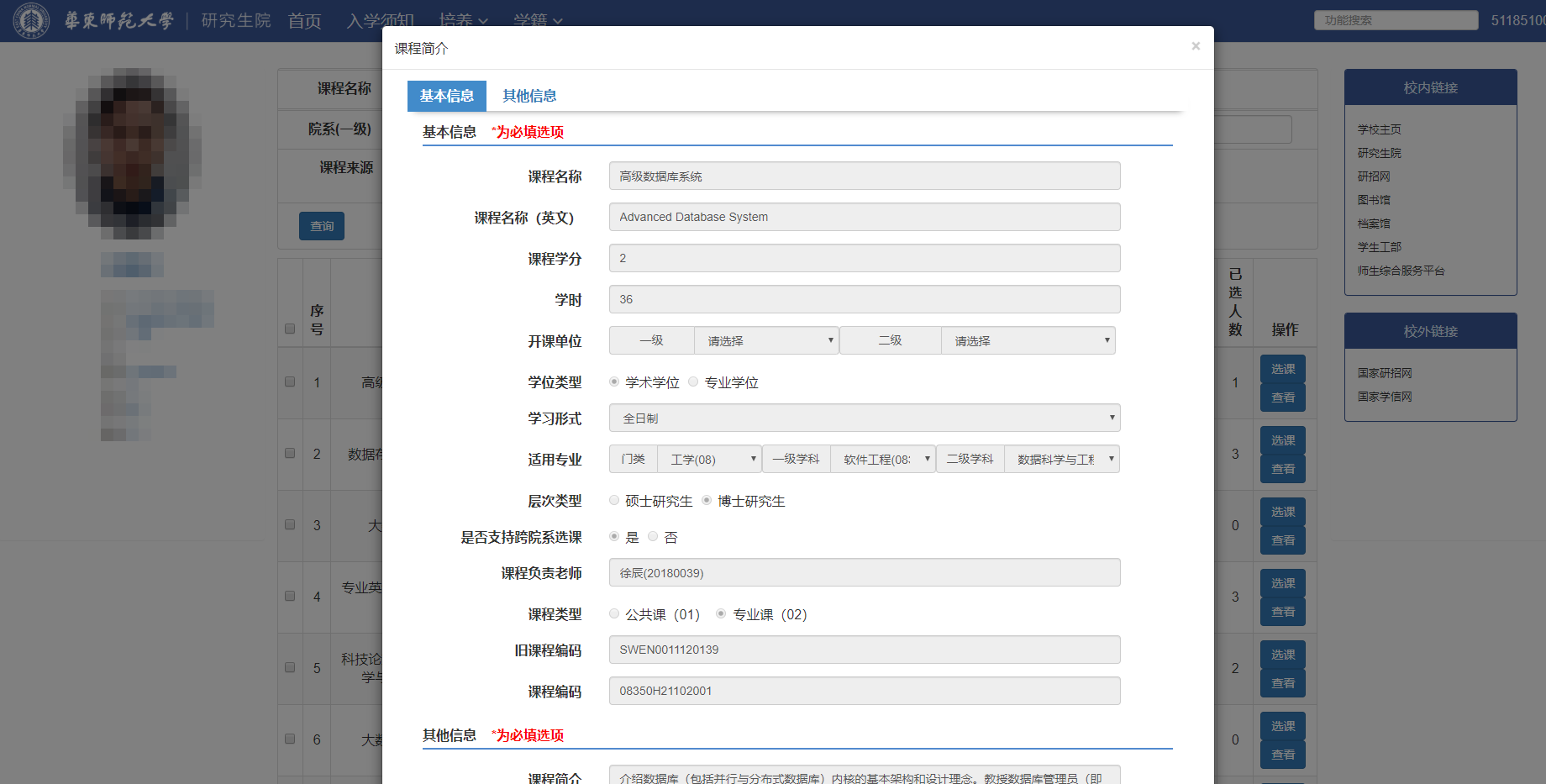 系统自动做学籍判断,对学术学位学生不显示“专业学位公共课”,相对地,对专业学位则不显示“学术学位公共课”与“学术学位公选课”课程来源,同时对于未导入培养方案学生亦不显示“本人培养方案内课程”和“本人培养计划内课程”。