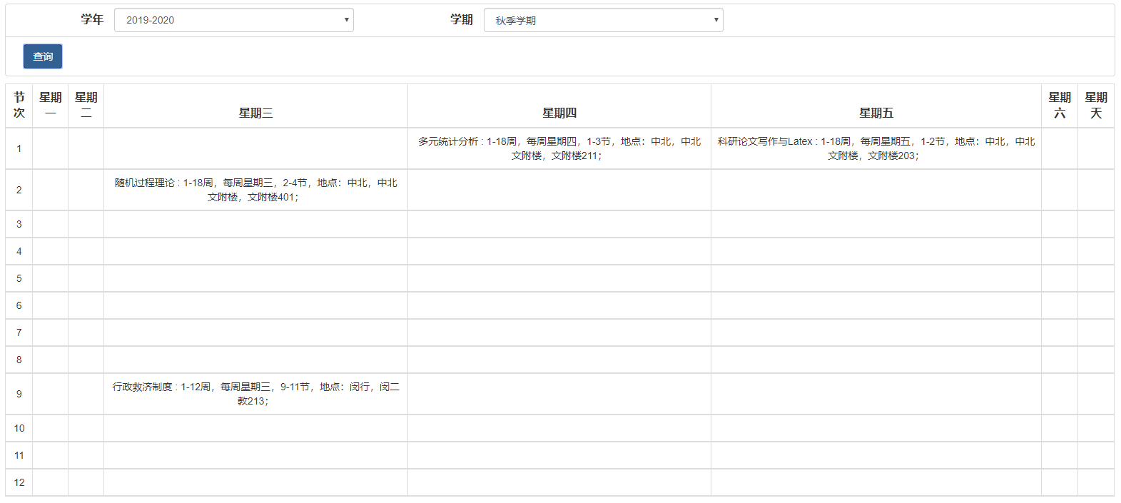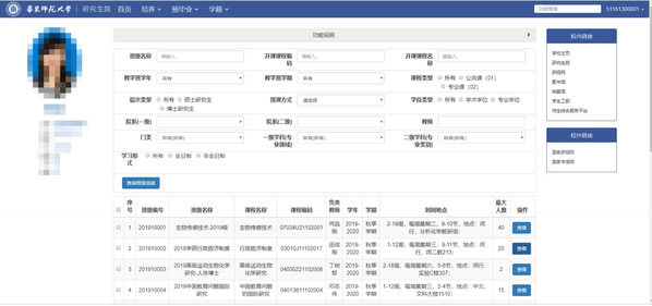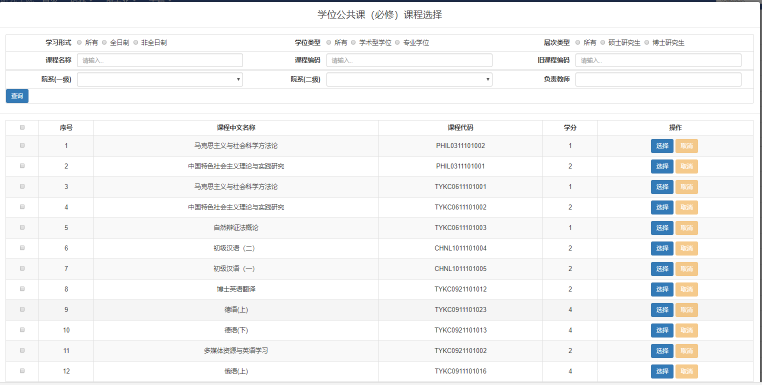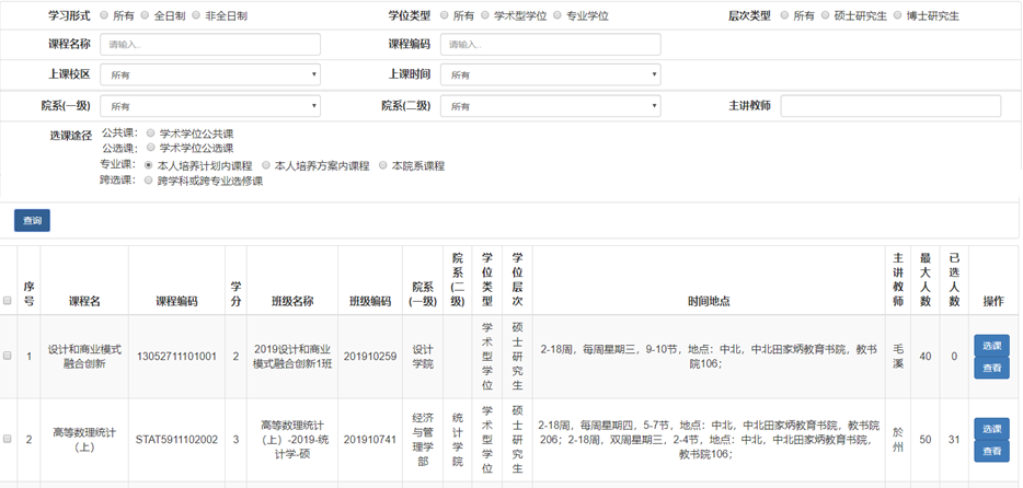 上半部分为查询条件,分别为“学习形式”,“学位类型”,“层次类型”,“课程名称”、“课程编码”、“上课校区”,“上课时间”,“院系一级”,“院系二级”,“主讲教师”和“选课途径”。其中,选课途径分为四类:公共课(学术学位公共课、留学生公共课,专业学位公共课),公选课(学术学位公选课),专业课(本人培养计划内课程,本人培养方案内课程,本院系课程),以及跨选课(跨学科或跨专业选修课)。