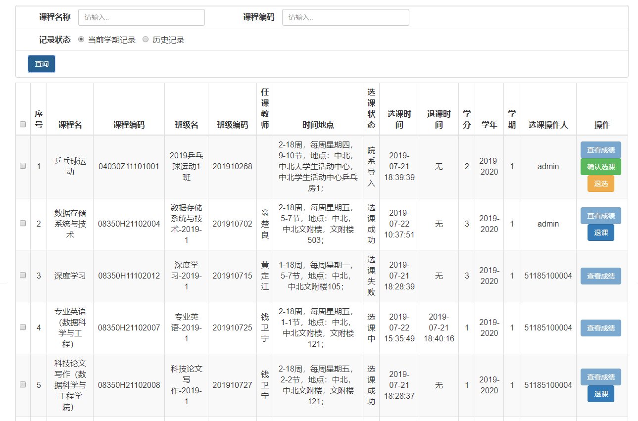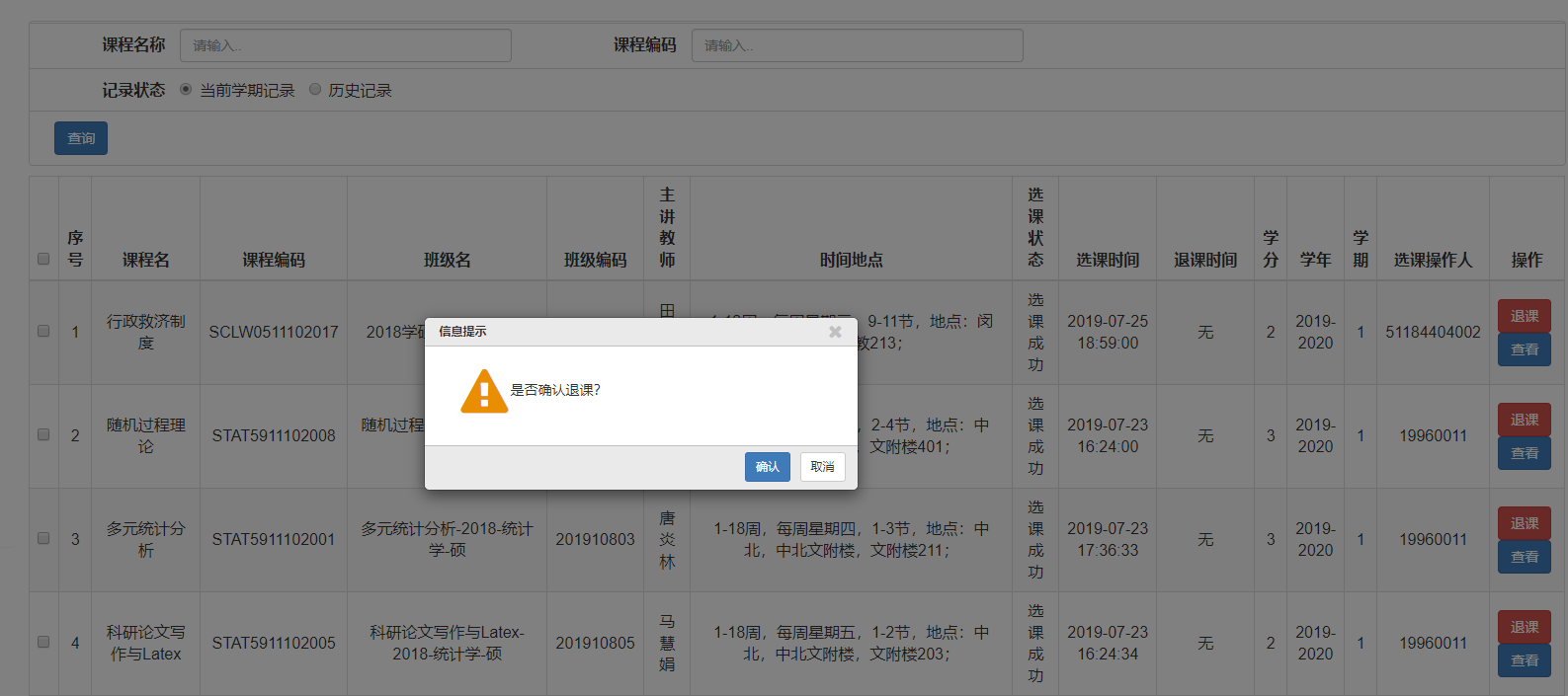 在选课成功后,可在“选课结果”中查询到当前学期和历史选课记录,见图14。可看到查询结果会有选课状态栏,学生选课状态共分为选课中、选课成功、选课失败、 退课、 院系导入五种状态,学生可在不同条件下,进行 “确认选课”、“退选”和“退课”的操作,学生在选课页面成功选课会将选课状态置为选课中,需要注意的是,在选课页面成功提交的记录并不代表选中,只是进入选课排队序列中,系统将会在后端进行处理,以先到先得的优先级决定学生选中该课程或是未选中,可在该页查询到选择课程的状态。选课成功的课程可选择退课,退课确认见图15,选课失败可在选课页面重新选课。选课为院系导入时学生可做“确认选课”和“退选”的操作,确认选课后才真正选课成功,退选则不会选择该课程。
