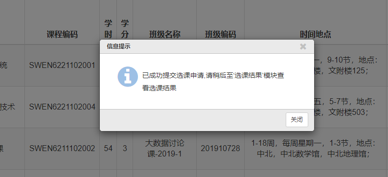 页面下半部分为根据条件查询得到的开课班级,根据班级可进行选课操作,点击操作中“选课”按钮,得到提交结果,如图12,对于已选中课程与已修读并考核通过的课程不可重复选课。也可以点击“查看”按键查看课程信息,见图13。