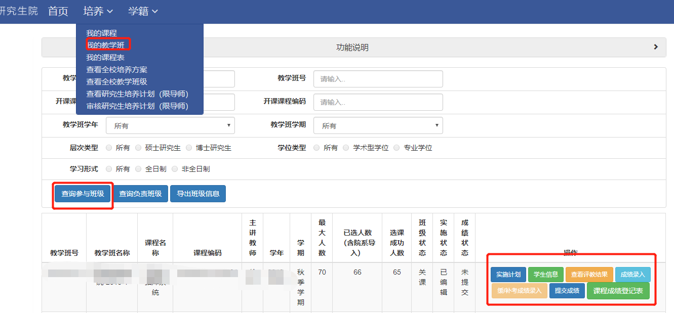 在每个教学班可查看教学信息、查看学生选课情况、导出考勤册、录入成绩和查看评教结果等。见下图6。