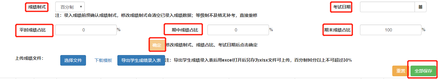 ①教师填写成绩制式、考试日期和各项成绩占比,并点击“确定”进行保存。