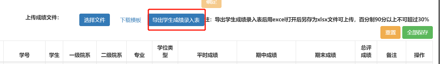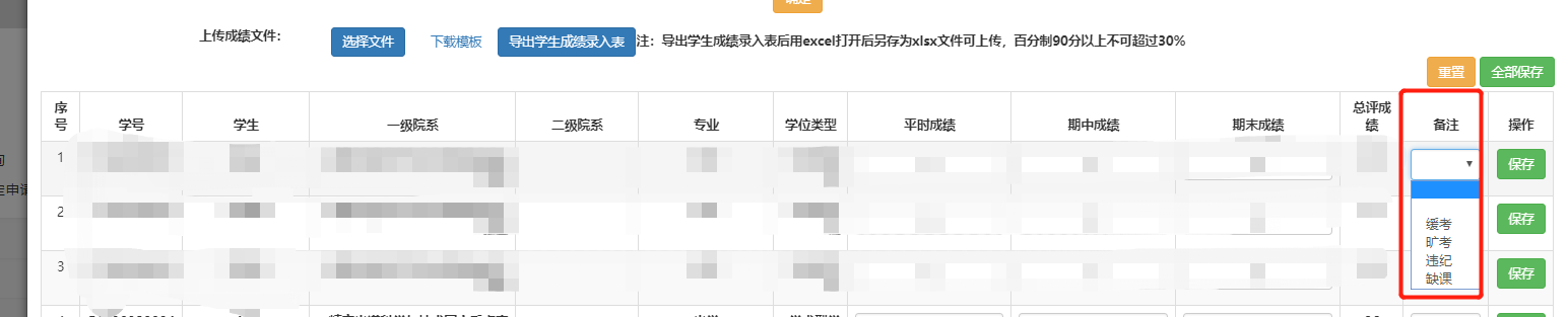 ②教师录入或者导入成绩,核对无误后点击“全部保存”。