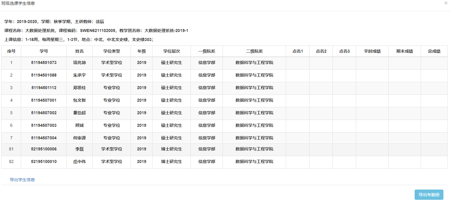 教师点击“学生信息”可查询和导出班级学生的名单,见下图7。“导出学生信息”包含有非最终选课成功学生的信息,“导出考勤册”中仅包含选课成功的学生,根据需要下载使用。关闭该页面,可点击右上角“x”或者按“ESC”键。请您注意,未经选课的学生,不得参加课程学习和考核,成绩不予记载。
