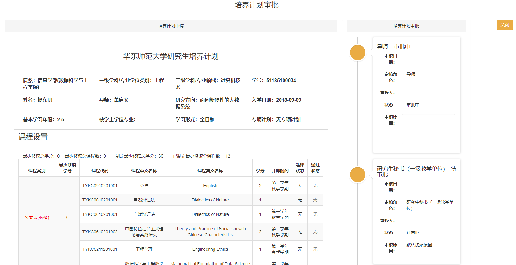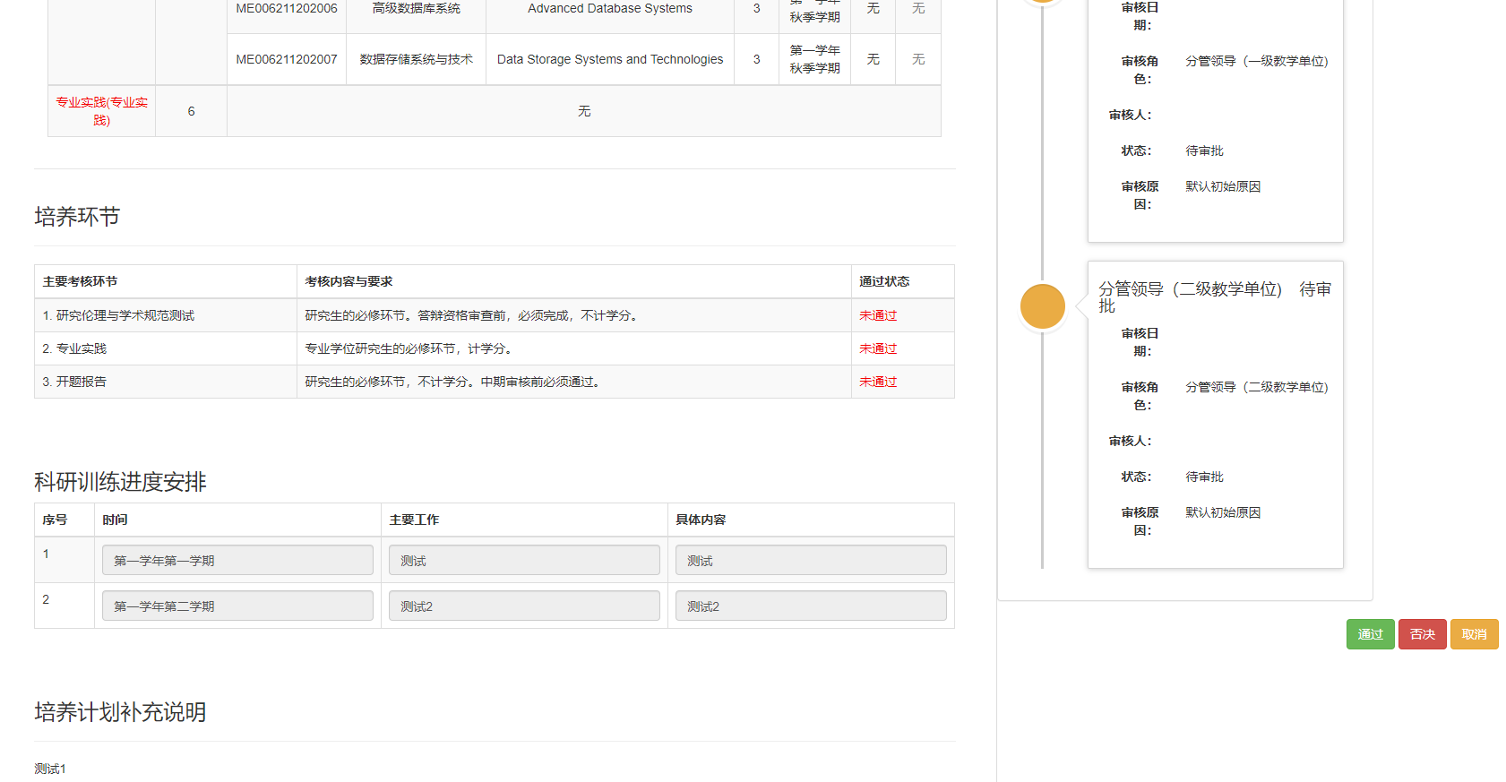 点击“待审批”,可查看并审核所指导研究生的培养计划,点击通过则培养计划进入下一级审批步骤(目前培养计划审批流程为导师->院系秘书->院系分管领导),审批界面如下图: