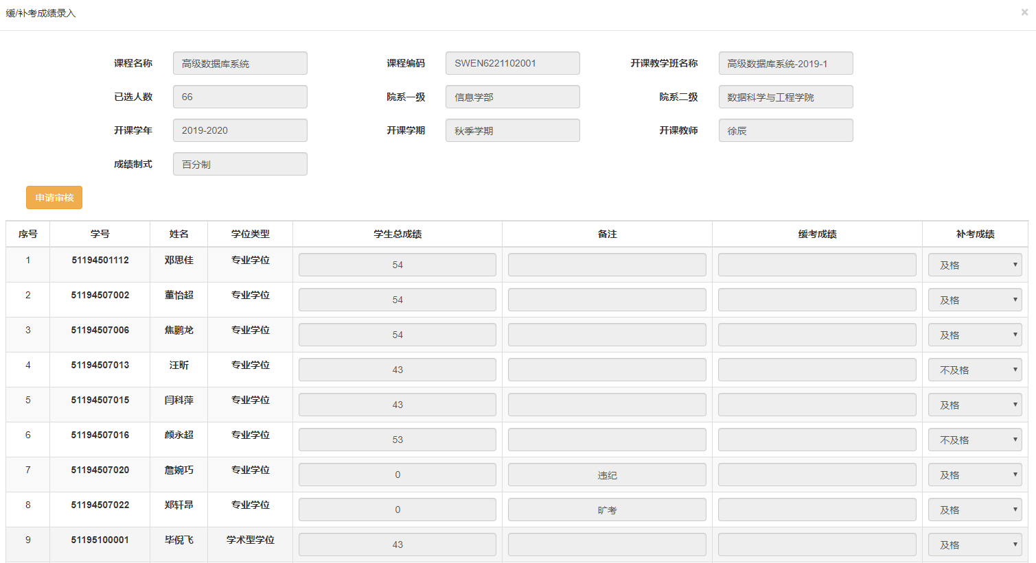 在缓补考成绩评阅完毕后,可使用“缓/补考成绩录入”功能录入学生的缓考、补考成绩,缓考为原成绩制式输入,补考成绩只有“及格”或“不及格”两种状态(见图11),在录入成功后,可提交审核申请,由院系研究生工作秘书审核。