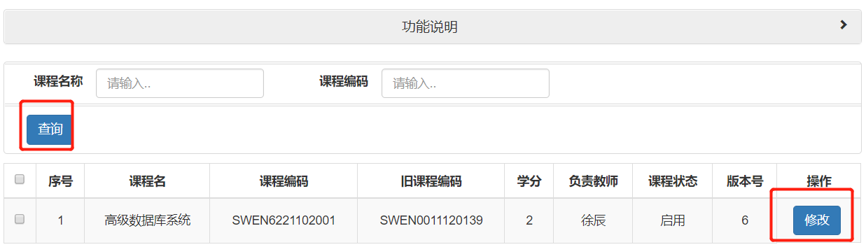 教师点击“查询”、“修改”可查看、维护自己负责的课程,见图5。任课教师应在每学期开学前更新和维护课程大纲。