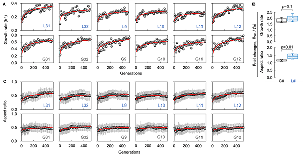 实验中我们选取了基因组精简版的大肠杆菌(MDS42ΔgalK::Ptet-gfp-kan)菌株。该菌株稳定表达绿色荧光蛋白,可用量化成像流式细胞仪(IFC)来进行细胞监测和群体分析。本研究利用OAVs或葡萄糖作为唯一碳源的最小培养基培养大肠杆菌,分别进行了6组独立的进化实验(L#,G#)。基于IFC监测分析每天继代的细菌浓度,形态变化,蛋白表达量等。其中6组进化实验(L#:L31,32,9~12)来自于同一祖先(Ori),在OAVs为唯一碳源的培养基中进化500代,各自的生长速率逐渐增加(图1A)。这6个种群(L#)的适应度普遍提高,表明大肠杆菌能够利用OAVs作为碳源,这可能是对富含脂肪酸囊泡的原始类环境的适应。相比之下,葡萄糖作为唯一碳源的平行进化实验(G#:G31,32,9~12)的生长速率高于OAV组,但与OAV的动态变化相似(图1A)。有趣的是,进化后的细菌(G#,L#)和原始菌(Ori)生长速率的倍数变化在OAVs和葡萄糖组之间不显著(p=0.1),表明在OAVs存在的情况下,其适应度的提高幅度与葡萄糖存在情况下适应度的提高幅度相当。可以推断,在实验室条件下模拟原始环境中的碳源,诱导现代细菌进化是可行的,且与常规的以糖为碳源的实验进化具有可比性(图1B)。细菌的形状通过横纵比进行评估,横纵比代表细胞的长轴与短轴的比值,所以横纵比越接近1,细胞的形状越接近球形。结果表明,在OAV的进化谱系(L#)中,细胞群体的平均横纵比逐渐增加,而在葡萄糖的进化谱系(G#)中则不完全相同(图1C)。虽然不论是在OAV还是葡萄糖中,进化实验都提高了其横纵比(Evo/Ori > 1),但OAVs的变化幅度显著(p=0.01)大于葡萄糖(图1B)。