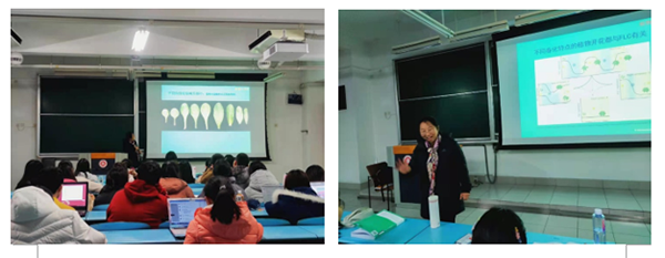 随后,孙老师围绕开花所需要的光、温度等条件,以及关于开花的生理、分子生物学机制和前沿研究进展展开。贴梗海棠在冬天虽然开了,但是只开了一朵,和春天盛开的情况是有差别的,孙老师从自然条件和植物开花机理上进行了细致的解释。孙老师讲授熟练、细致,娓娓道来。学生和听课的教师都听得非常入神。