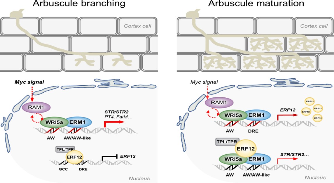 图三. 共生过程中ERM1/WRI5a–ERF12–TOPLESS复合体动态调控营养转运模型