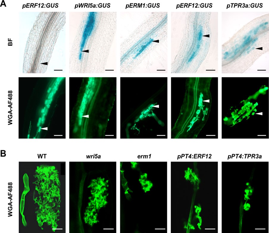 本研究首先证明Half-size ABCG转运蛋白STR通过与STR2形成转运二聚体,介导苜蓿脂肪酸向丛枝细胞供应。接下来,以STR2在丛枝菌根真菌共生中的功能及其调控机制为起点展开研究,鉴定到ERF家族两个新的转录因子ERM1和ERF12拮抗调控营养交换基因表达和丛枝发育。其中,ERM1通过靶向AW-box与AW-box-like元件激活下游脂质合成及转运相关的靶基因表达,正调控菌根共生。ERF12是植物中鉴定到的首个负调控丛枝营养交换的转录因子,可通过招募TOPLESS家族辅抑制因子TPR3a,负调控菌根共生。