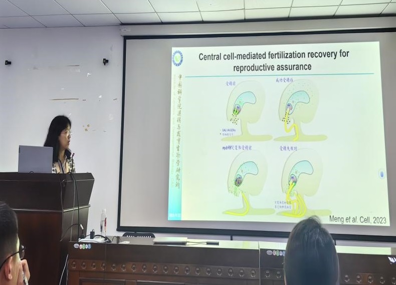在报告的后半部分,李老师讲述了其团队近期在《Cell》杂志上发布的最新研究成果,即当被子植物因花粉效率低等原因导致受精失败时,中央细胞分泌的SALs小肽可以作为受精失败恢复的主要因子进行花粉管吸引,从而提供受精保障机制。