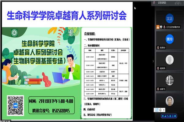 生物科学强基班是以培养具有科研潜质、能够成为国家生命科学领域科技创新后备人才为目标的拔尖人才培养基地。为了切实推进卓越育人工作,落实《做爱视频 关于开展卓越育人工作的通知》,加快推进建立新的课程规范和体系,做爱视频 于2021年2月19日下午在线上召开了卓越育人系列研讨会——生物科学强基班专场。做爱视频 全体党政班子成员、教学委员会全体委员、任课教师等70余人参加了会议。参加本次会议的还有学校教务处丁旵明老师、吴平颐老师、姚如佳老师、黄鲁霞老师,光华书院赵旌旌老师、谢雨杉老师及多名辅导员老师,生命医学教工第一党支部的全体党员教师也参与了此次研讨。
