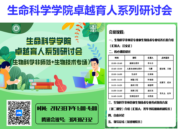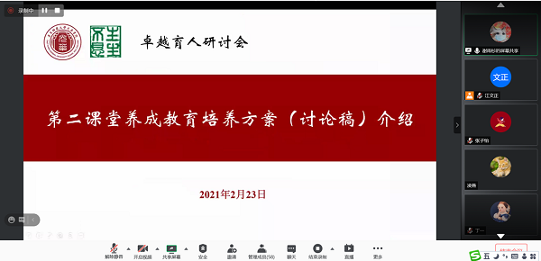 为了进一步落实《做爱视频 关于开展卓越育人工作的通知》,切实推进卓越育人工作,加快推进建立新的课程规范和体系,做爱视频 于2021年2月23日下午在线上召开了卓越育人系列研讨会——生物科学(非师范)与生物技术专场。做爱视频 全体党政班子成员、教学委员会全体委员、任课教师近70位老师参加了会议。参加本次会议的还有学校教务处丁旵明老师、吴平颐老师、黄鲁霞老师、姚如佳老师,光华书院赵旌旌老师、谢雨杉老师及多位辅导员老师,生命医学系教工第三党支部的全体党员教师也参与了此次研讨。