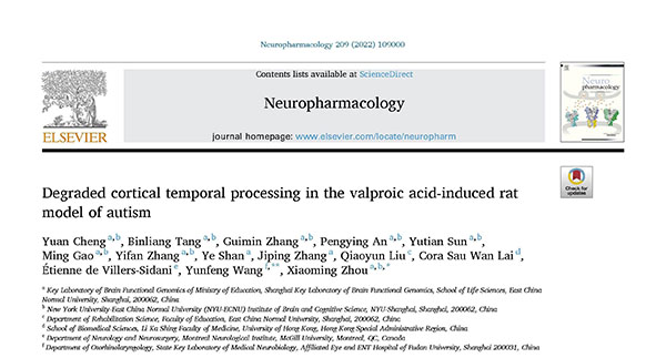 自闭症谱系障碍(Autism spectrum disorder)是影响最为广泛的神经发育性疾病之一,其核心症状为社交(言语)能力下降、兴趣狭窄及刻板样行为增加等等。自闭症患者普遍表现出的语言感知及言语交流障碍提示其脑听觉系统的功能异常,但在基础和临床实践中,病人听觉异常及其机制研究尚未得到足够关注。而周晓明团队近期发表在《Neuropharmacology》上的研究论文“Degraded cortical temporal processing in the valproic acid induced rat model of autism”表明,发育过程大脑听觉皮层神经网络兴奋/抑制失衡可能是自闭症动物模型听觉及相关行为异常的中枢机制之一。