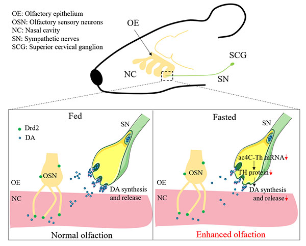 为什么人们在饥饿时会觉得饭菜更香?这是因为一定时间的禁食会增强嗅觉功能。人和动物在饥饿时嗅觉增强有助于觅食,这对进化过程中物种的生存尤为重要。我们的研究结果发现,饥饿时,小鼠鼻腔中多巴胺合成减少,对嗅觉功能产生去抑制,引起嗅觉敏感性增加。 更有意思的发现是,鼻腔给予正常小鼠6-羟基-多巴胺,损毁支配鼻粘膜的交感神经末梢,降低鼻腔内多巴胺的来源,可以使正常小鼠的嗅觉能力提高到饥饿小鼠的水平。这些结果证明,饥饿时小鼠鼻腔中多巴胺合成减少可能是饥饿导致嗅觉能力增强的重要机制之一(图4)。