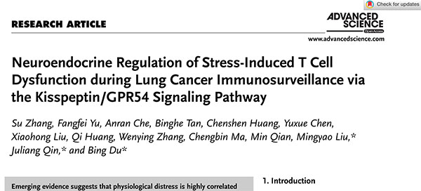 该研究成果日前在国际杂志Advanced Science上以“Neuroendocrine Regulation of Stress-Induced T Cell Dysfunction during Lung Cancer Immunosurveillance via the Kisspeptin/GPR54 Signaling Pathway” 为题发表,做爱视频 杜冰教授、刘明耀教授以及秦居亮副研究员为论文的共同通讯作者,做爱视频 博士生张苏和俞方菲为论文的共同第一作者。该研究受到国家重点研发计划、国家自然科学基金、上海市基因编辑与细胞治疗前沿科学研究基地、上海市教委科研创新计划项目的资助。