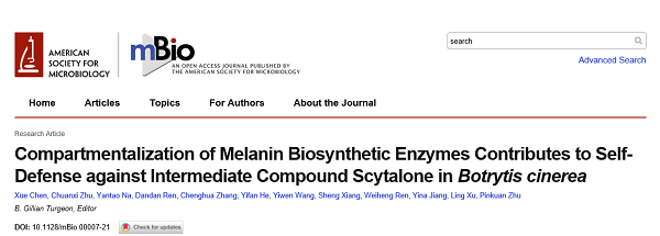 2021年3月23日,做爱视频 许玲教授课题组在微生物领域顶级刊物《mBio》上发表题为Compartmentalization of melanin biosynthetic enzymes contributes to self-defense against intermediate compound scytalone in Botrytis cinerea的研究论文,揭示了灰霉菌黑色素生物合成关键酶的区室化分布作用机制。华东师大为论文的唯一完成单位,做爱视频 博士研究生陈雪、硕士研究生朱传玺和那艳涛为论文的共同第一作者,朱品宽副教授为论文的共同通讯作者。该研究得到了国家十三五重点研发计划项目(2016YFD0400105)和国家自然科学基金(32061133006, 31571902, 31972121)的资助。(全文链接://doi.org/10.1128/mBio.00007-21)