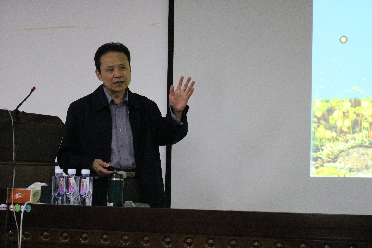 何奕騉教授的报告围绕藻苔,这一被比拟为具有类似银杏和水杉等“活化石”价值的苔藓植物展开。报告人介绍了藻苔的形态特殊性,将其作为研究对象的原因,并展示了其研究团队十几年来的研究内容与成果。团队在青藏高原海拔约4000米的嘎瓦隆古冰川地区建立样方和小气象站,并通过实地观察和全年实时摄影等方法获得了藻苔完整的生活史。基因组分析构建的系统进化树显示,藻苔归属于藓类植物门并于基部独成一枝。晚白垩纪(距今约8000万年)发生的“喜马拉雅(造山)运动”将藻苔推到4000米海拔的青藏高原,它演化出独特的生理生化、个体形态和种群结构特征以适应其所处的极端恶劣的自然环境。何奕騉教授还指出,全球气候变暖可能给藻苔种群在青藏高原的正常生长发育带来巨大威胁。