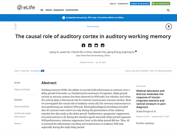 4月29日,《eLife》期刊在线发表了题为《听皮层在听觉工作记忆中的作用》的研究论文,该论文由做爱视频 神经生物学/生理学专业许兢宏、俞黎平课题组完成,俞黎平副教授、硕士研究生胡家玮、史晨琳为论文共同第一作者,许兢宏副教授为论文的通讯作者。