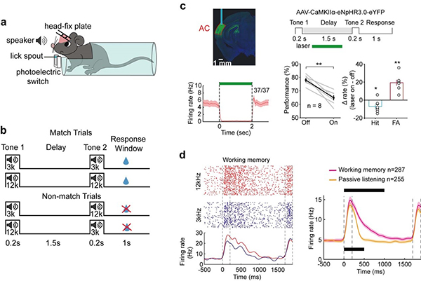 a, 听觉工作记忆行为装置。b, 听觉工作记忆任务示意图。c, 通过光遗传手段在延迟期失活听皮层锥体神经元,降低了动物的工作记忆行为正确率。d, 在完成听觉工作记忆任务时,听皮层单个神经元的电活动。