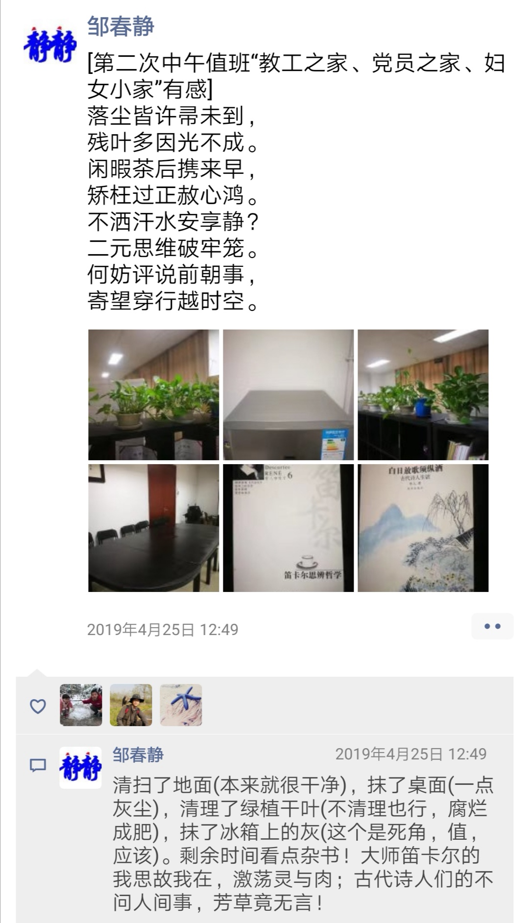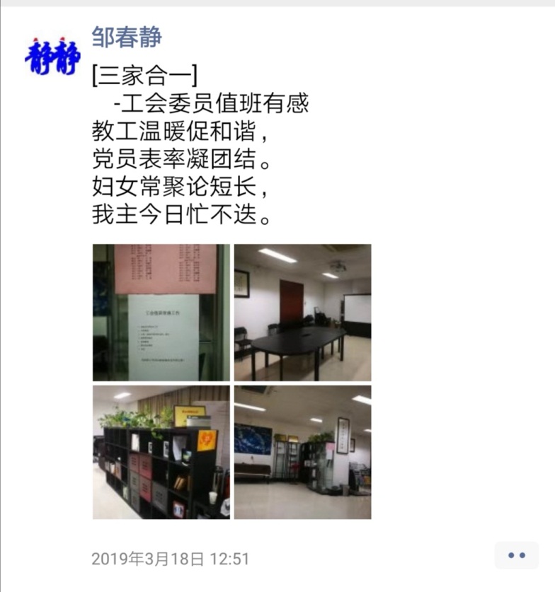 即便老师们日常工作十分忙碌,他们仍旧从自己的休息时间中抽出空闲时间来参加“教工小家”的建设。整理书报架,收拾柜橱,给小家里的绿植浇水,检查运动器材,排除安全隐患以及一些清洁打扫任务,都是老师们值班时的工作。