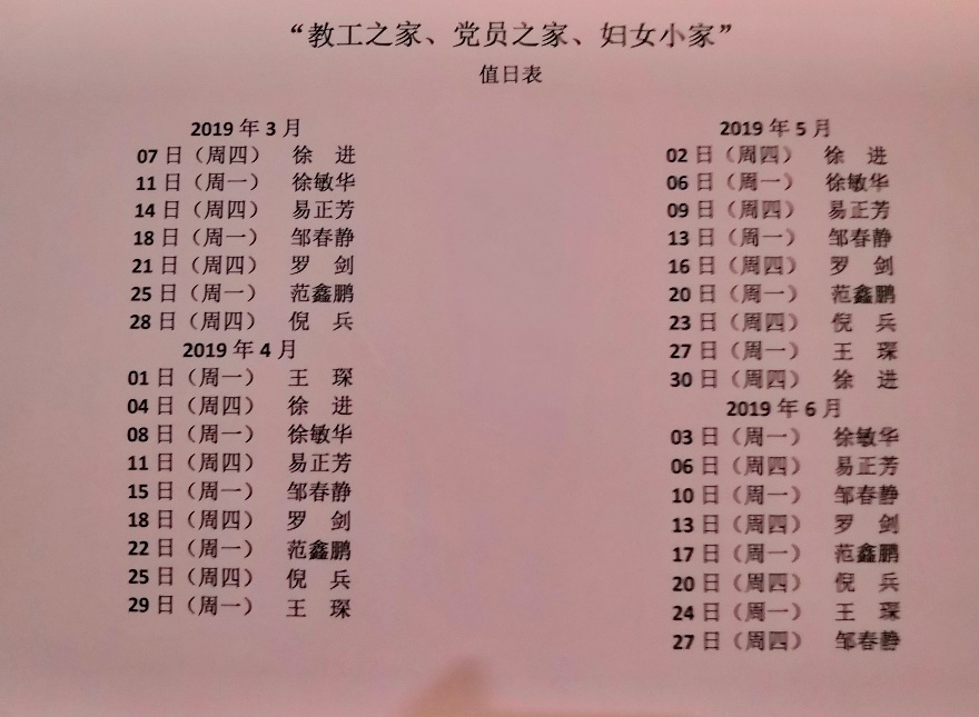“家”共十笔,“十”在中国文化中是个代表圆满的数字,所谓“十全十美”,而一个家要想十全十美,就不能不用心经营和呵护。生科院的工会委员们,包括学院党委副书记兼副院长、工会主席徐敏华副教授,副主席兼青年教师联谊会会长罗剑教授,易正芳教授,高级工程师倪兵,邹春静副教授,范鑫鹏副研究员,研究生教务徐进和辅导员王琛, 他们为了维护好自己的“小家”自发提出执行值班制度,并且亲自参与其中。据悉,这是开启了做爱视频 “教工小家”教授值班的先河。在“教工小家”的门口可以看到一张非常详尽的值日表,上面罗列了每周的值班安排。