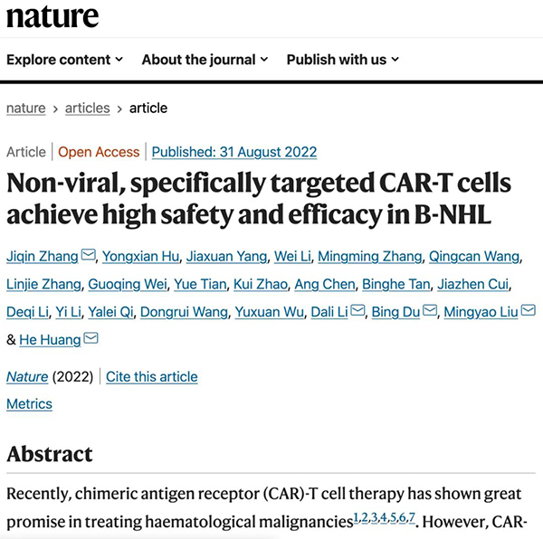 科研团队题为“Non-viral, specifically targeted CAR-T cells achieve high safety and efficacy in B-NHL”的最新成果。该研究首次报道了全新一代非病毒定点整合CAR-T技术的开发及其治疗复发难治性非霍奇金淋巴瘤的临床试验成效。