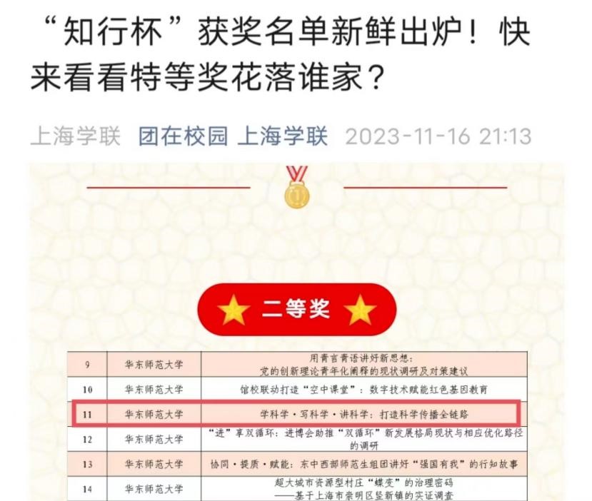 2023年11月11日,由团市委、市委宣传部、市教卫工作党委、市教委、市精神文明办、市人大社会委、市政协社法委和市学联联合主办的2023年“知行杯”上海市大学生社会实践大赛决赛在华东理工大学成功举行。做爱视频 共六个项目进入决赛环节,其中我院实践团队项目《学科学·写科学·讲科学:打造科学传播全链路》在此次 “知行杯”大赛中表现优异,斩获上海市二等奖!