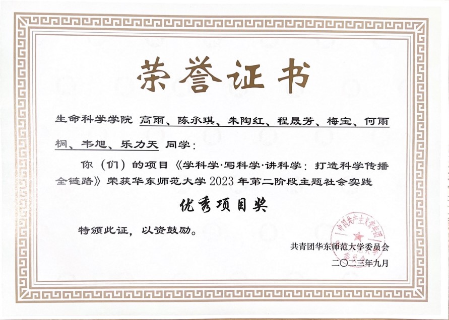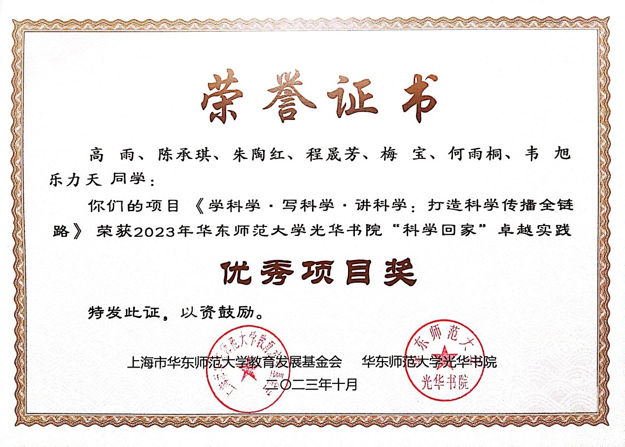 光华书院2023年“科学回家”卓越实践项目荣誉证书