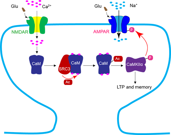 图1 SRC3乙酰化钙调蛋白CaM调节突触可塑性和学习记忆。神经活动激活NMDA受体,Ca2+内流引起SRC3乙酰化CaM,Ac-CaM更强地激活CaMKIIα,从而调控海马长时程增强和场景恐惧记忆。