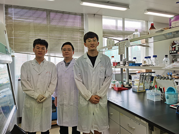 图2 殷东敏研究员(中)及主要作者张海龙博士(现在苏州大学工作)、博士生韩威(右)、硕士生杜银权(左)。