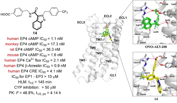 基于前述开发高活性、高选择性EP4拮抗剂的良好基础,团队进一步重点关注对化合物成药性的优化。团队结合已报道的EP4受体晶体结构信息,利用成熟的分子对接技术,开展基于蛋白晶体结构的理性药物分子设计,经过多轮改造和优化,成功获得了具有低nM水平EP4拮抗活性的先导化合物14(IC50 = 1.1 nM),与临床分子E7046(IC50 = 25.3 nM)相比,其活性提升超过20倍。化合物14展现出优异的亚型选择性,在多种GPCR药物筛选体系中均表现出良好的EP4受体拮抗活性,且不存在种属局限性。此外,化合物14对多种CYP450酶均无明显抑制作用,并展现出优异的代谢稳定性,更优的口服生物利用度和良好的安全性。